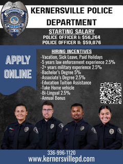 Kernersville Police Officers are offered competitive pay and an advantageous retirement plan. Pay scales are reviewed annually. Uniforms and equipment are provided.